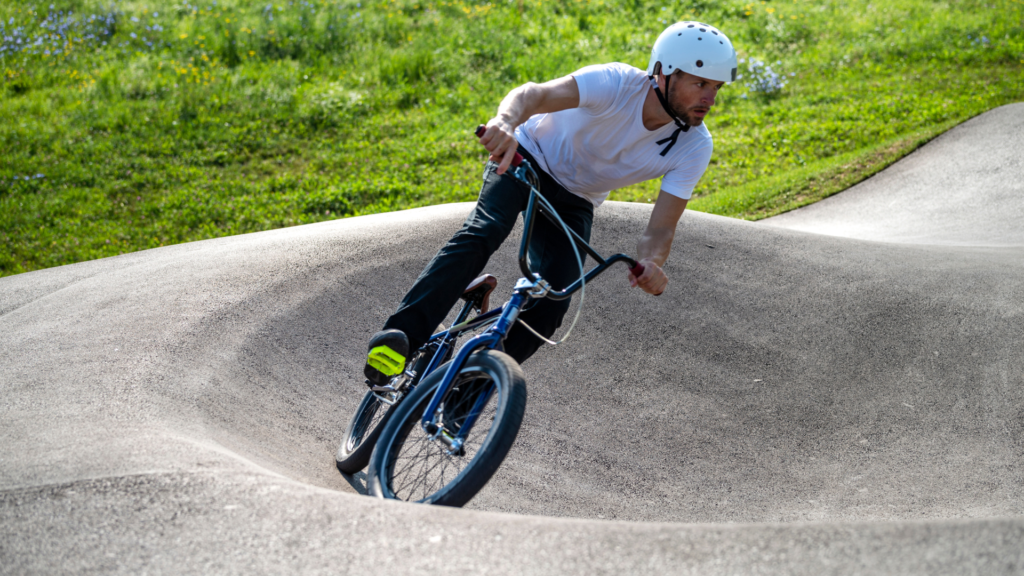 Piste en enrobé composée de bosses et de virages relevés, accessible à tous (BMX, Roller, Trotinette). Idéal pour travailler le physique et les trajectoires.